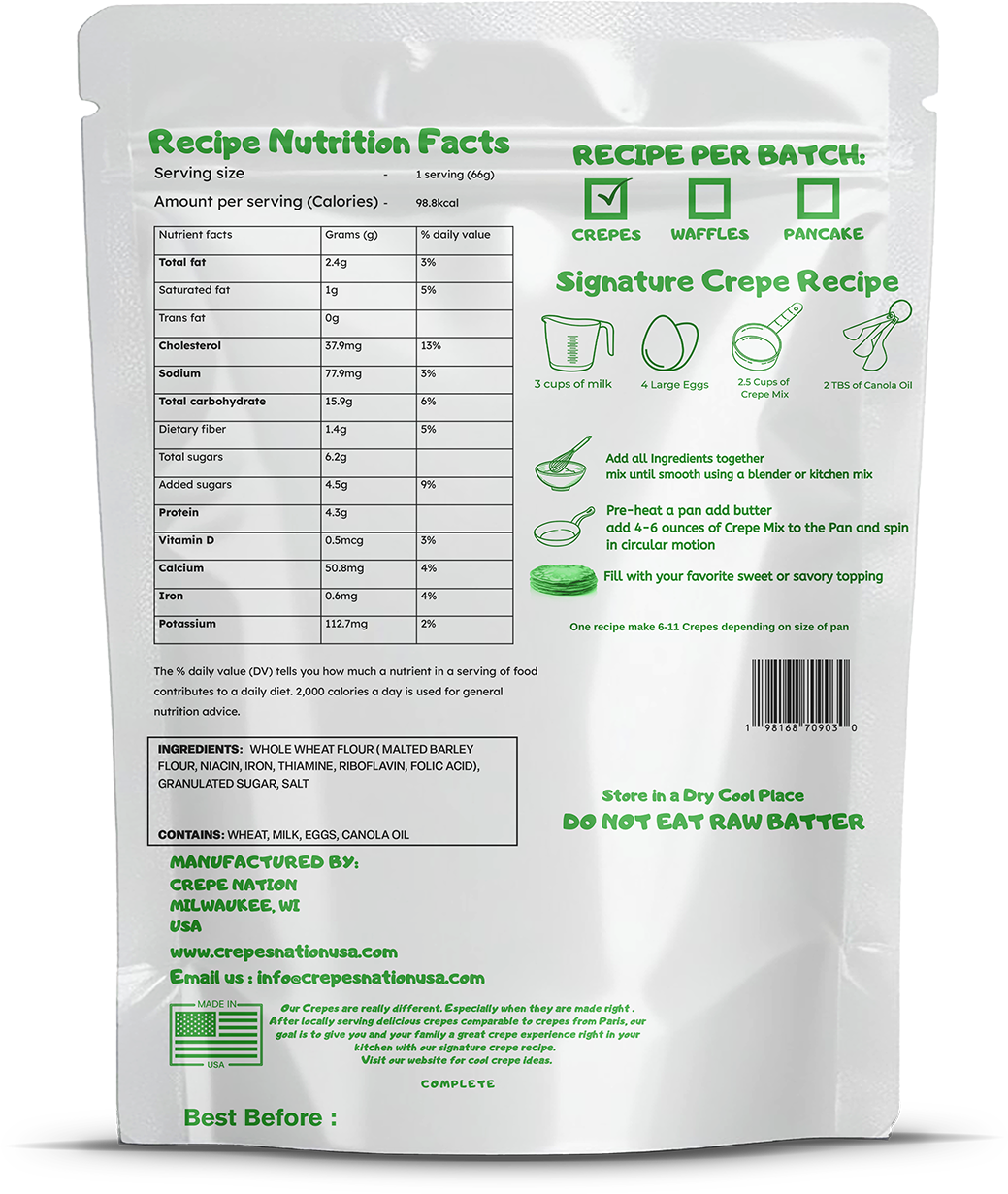 Enjoy wholesome goodness with our 1lb Whole Wheat Crêpe Mix, the perfect balance of nutrition and flavor. Made with 100% whole wheat flour, this mix creates light, tender crêpes with a rich, nutty taste. Each batch makes approximately 15 crêpes, ideal for breakfast, lunch, or dinner.